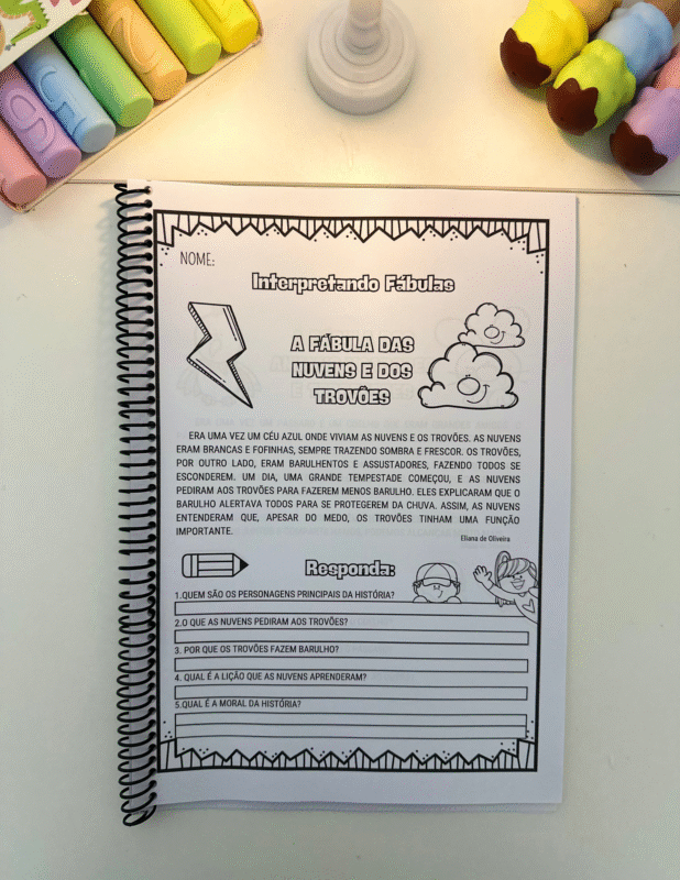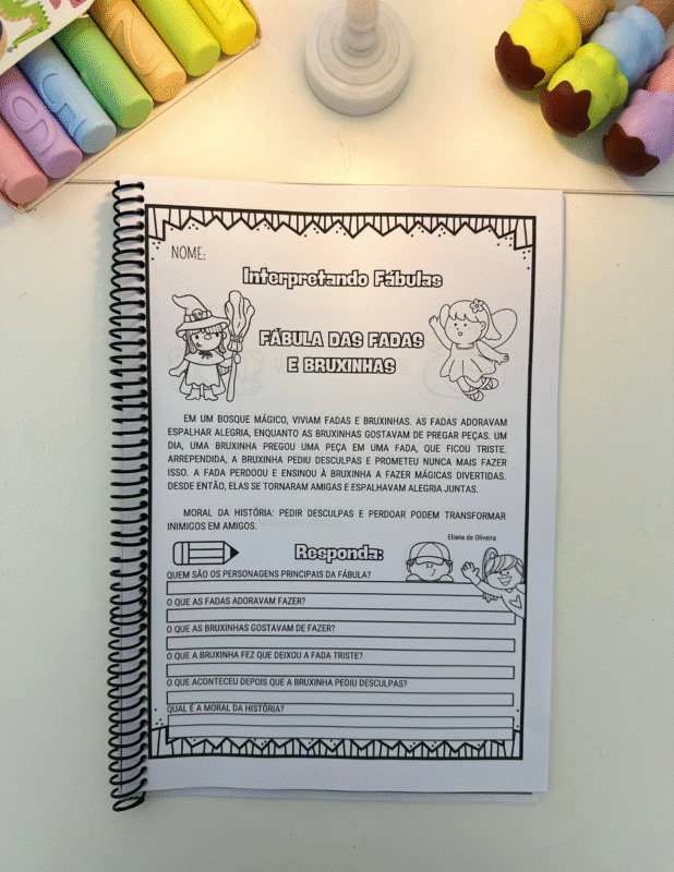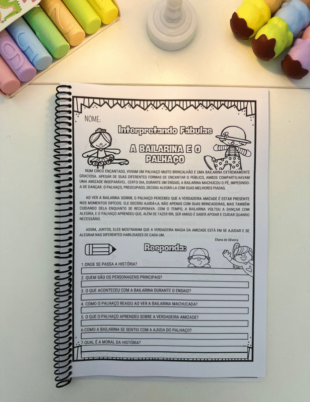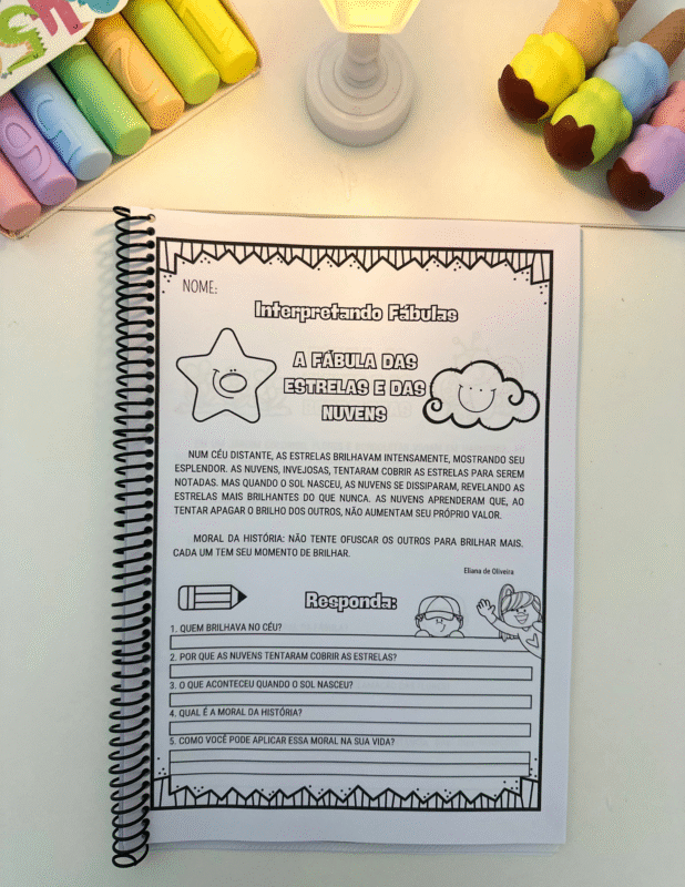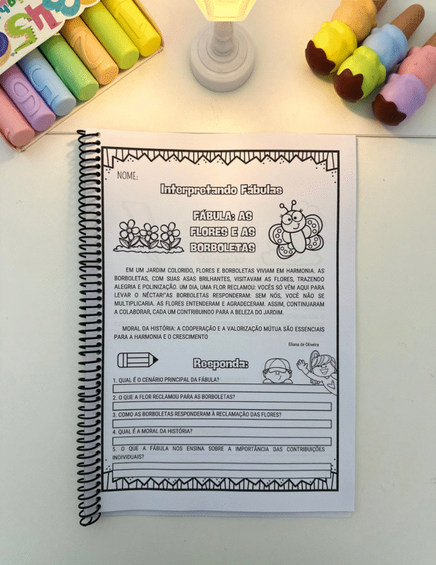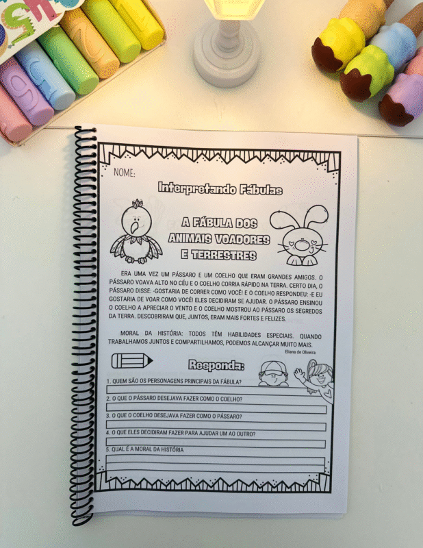 Cada página apresenta uma fábula original, escrita em linguagem acessível para crianças em fase de alfabetização, seguida de perguntas interpretativas que exploram: