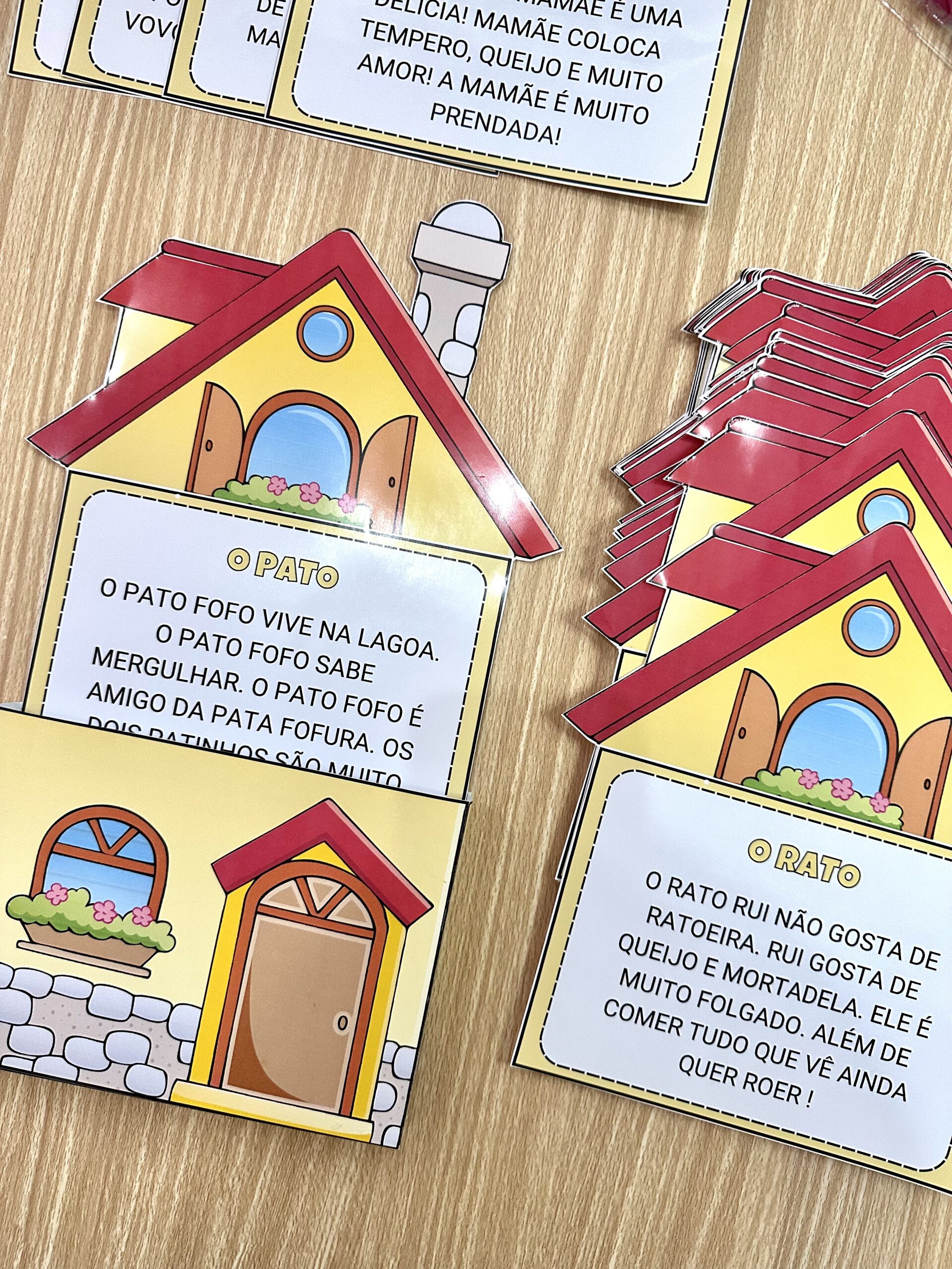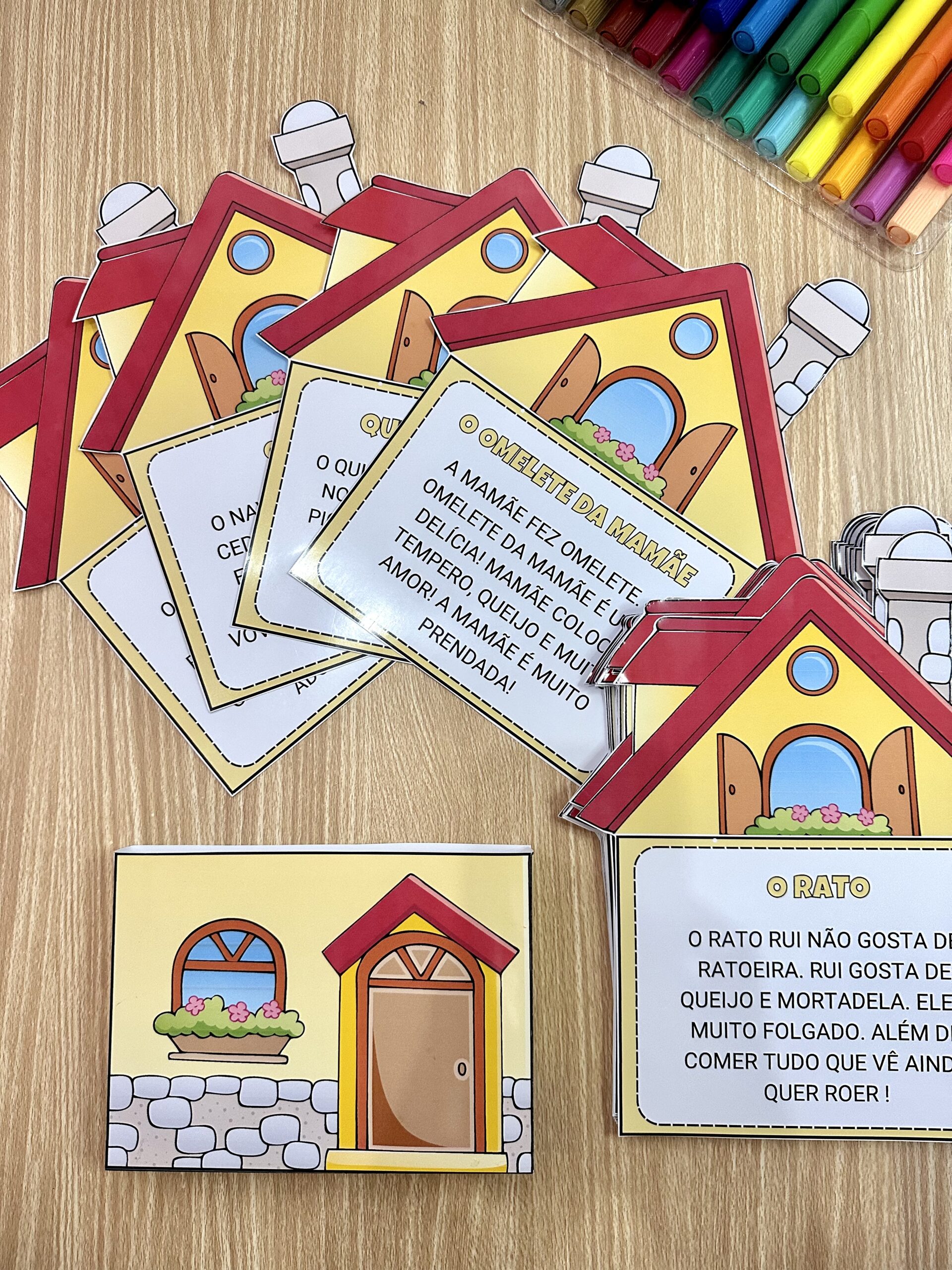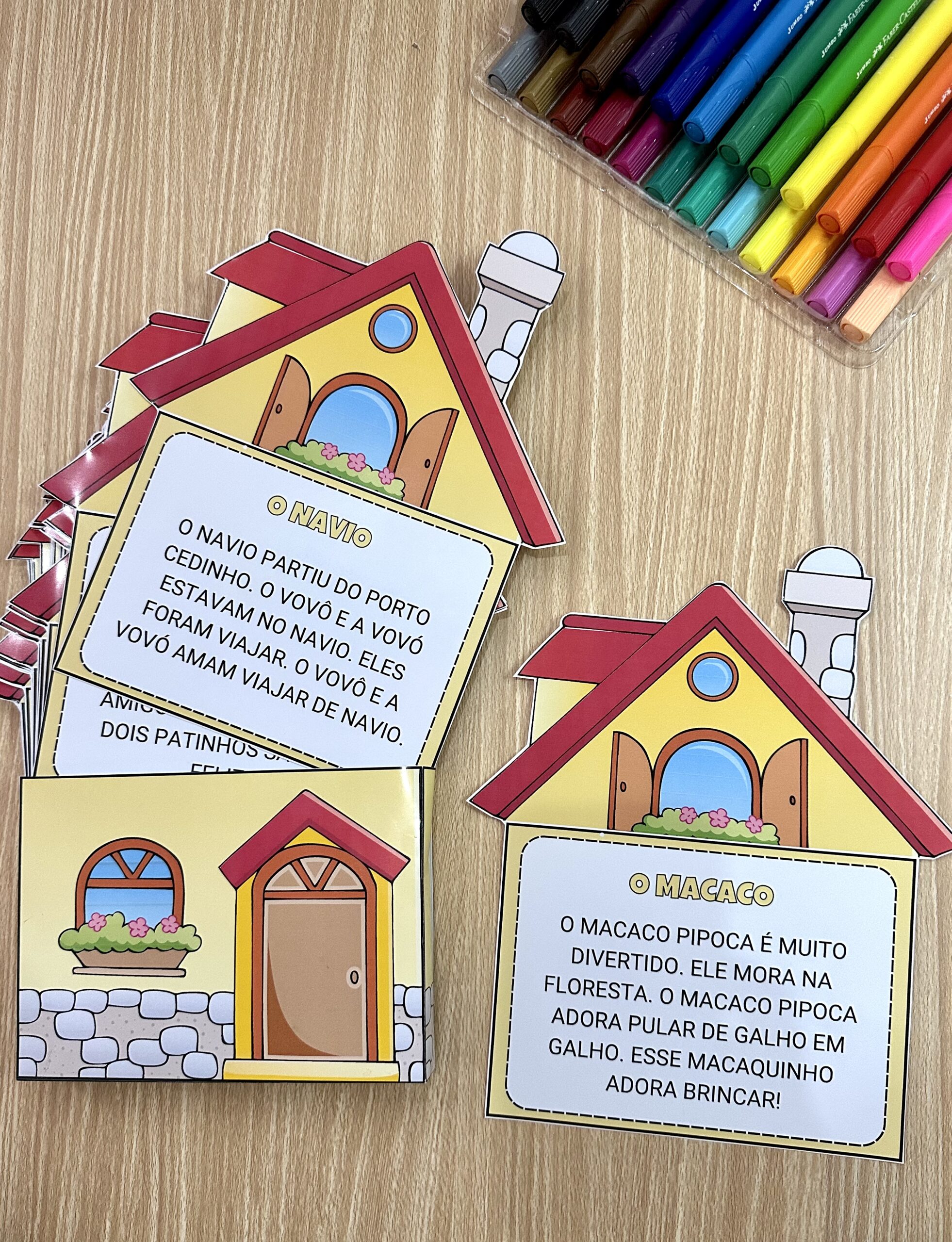 São textos ideais para crianças que estão em fase de alfabetização, com letra bastão maiúscula, e as fichas são em formato de casinha.