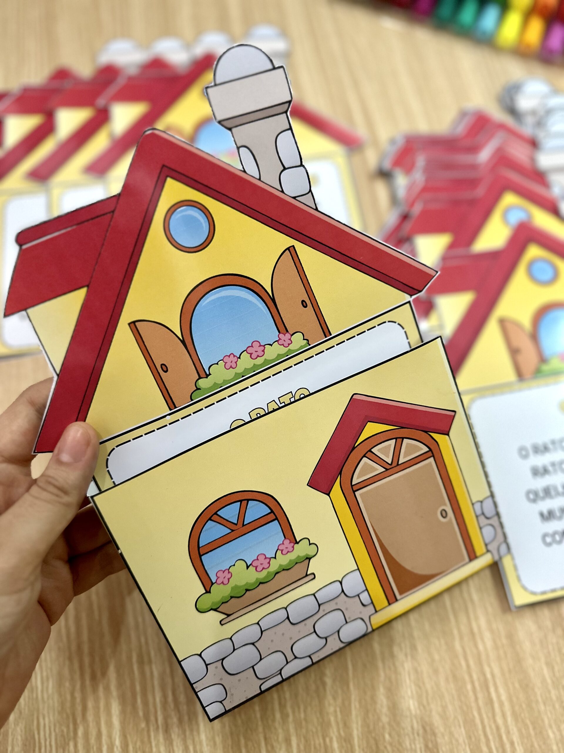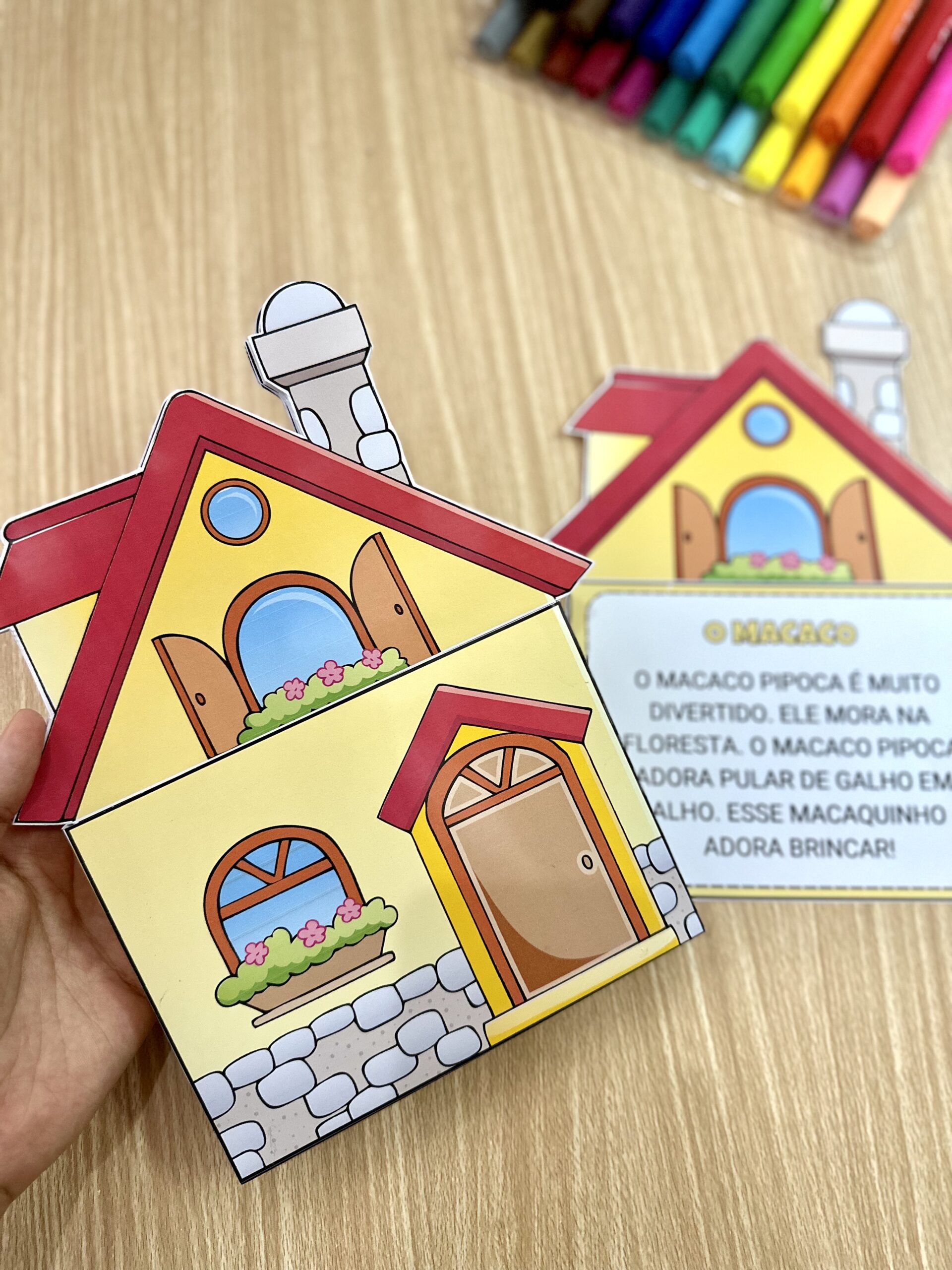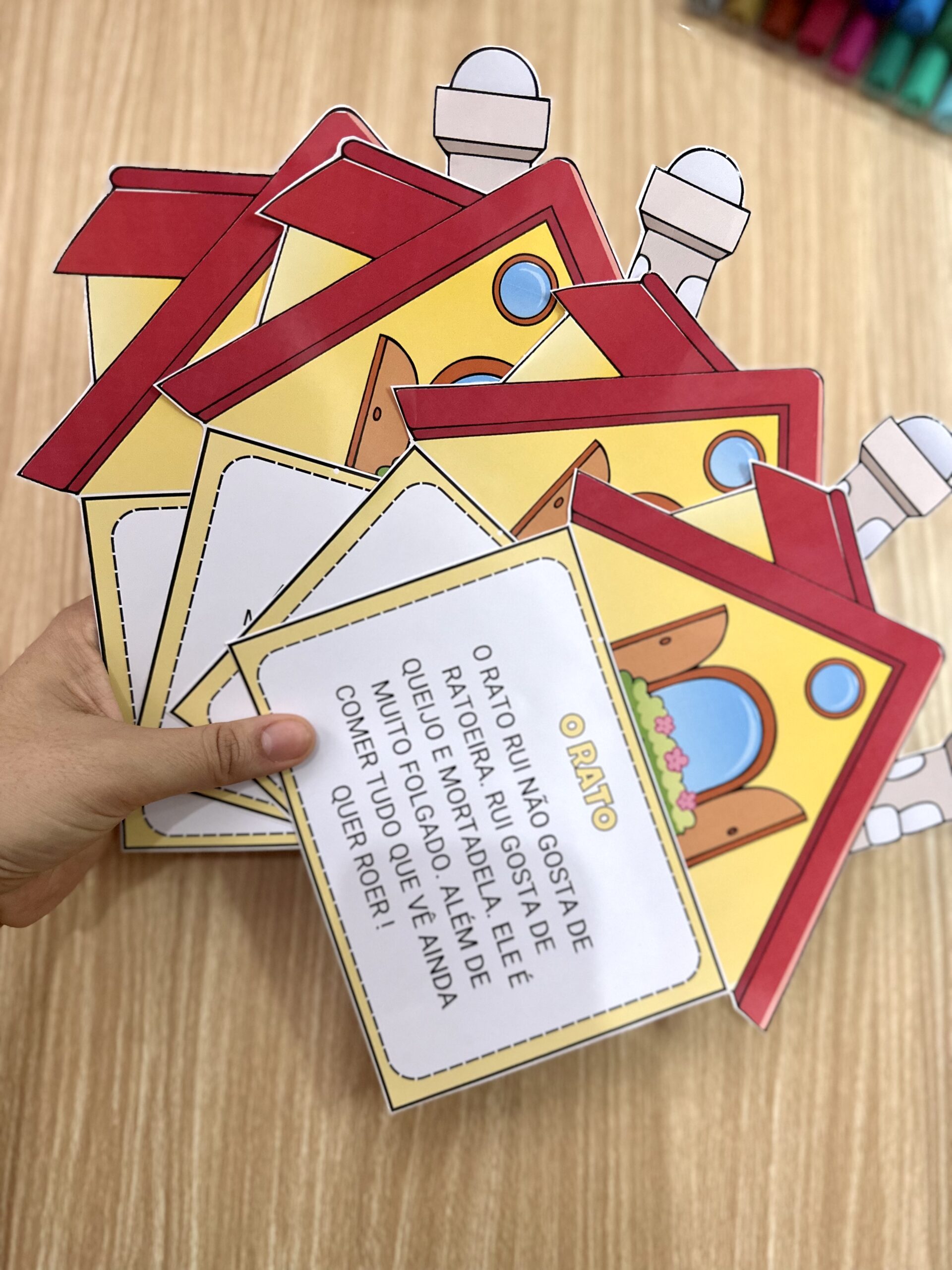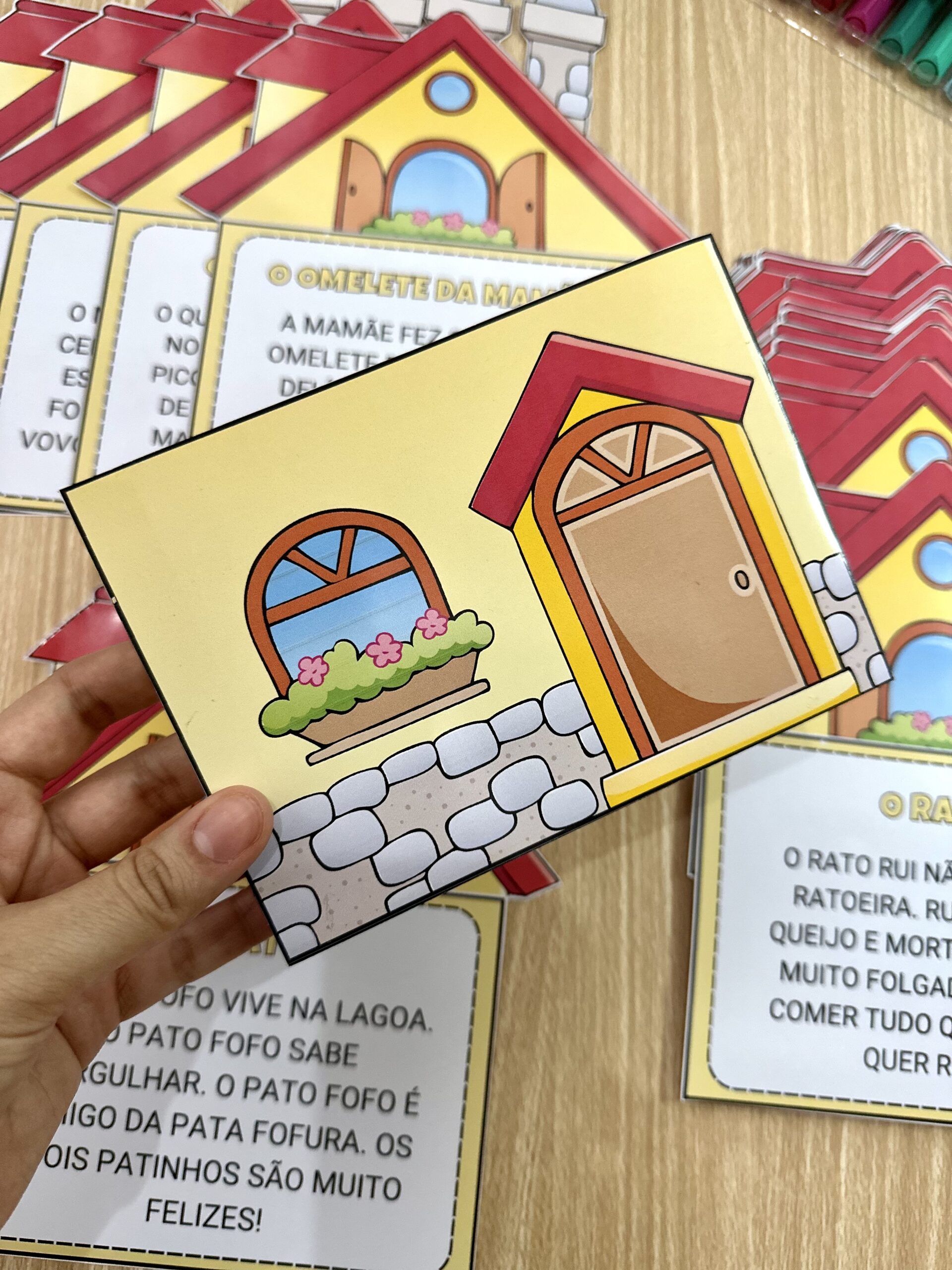 São textos ideais para crianças que estão em fase de alfabetização, com letra bastão maiúscula, e as fichas são em formato de casinha.