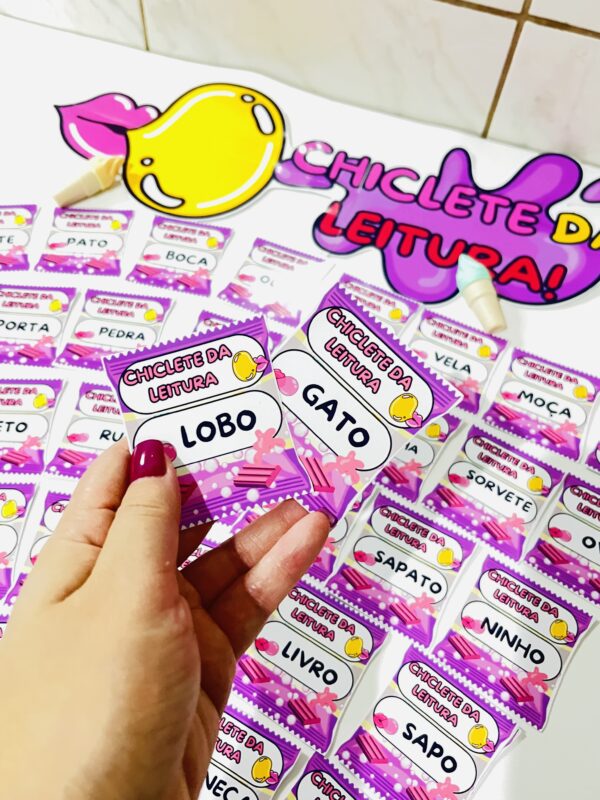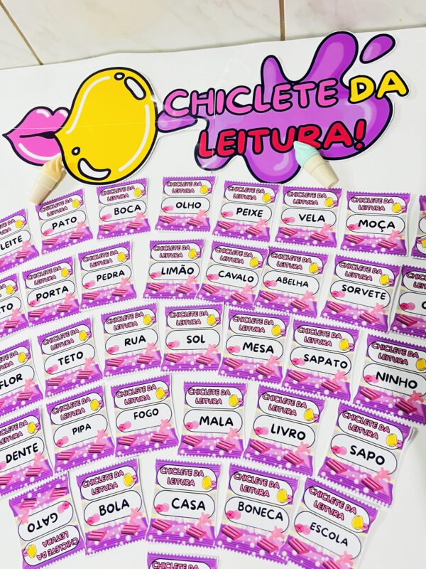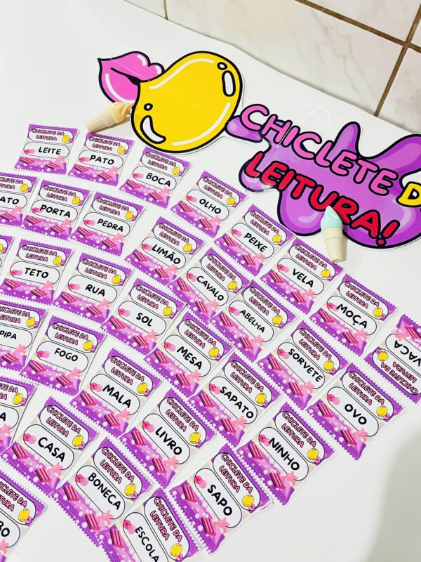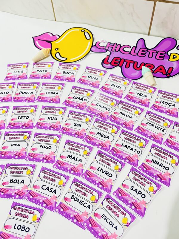 Apresentamos o Chiclete da Leitura, um arquivo especial com 30 palavrinhas essenciais, cada uma em um “chiclete” colorido para as crianças lerem, brincarem e se encantarem!