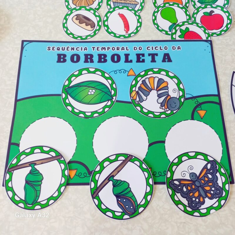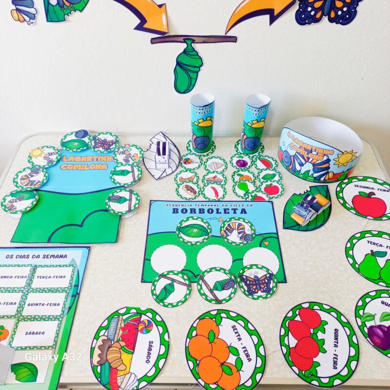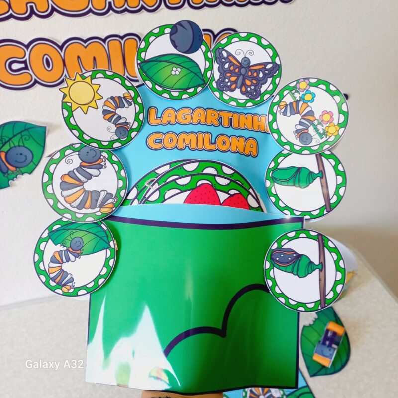 – A Lagartinha Comilona: você recebe o arquivo com a luva interativa da Lagartinha Comilona, um Mural do desenvolvimento da lagartinha, Coroa, Incentivo lúdico, Sequência temporal do ciclo da lagarta, Calendário dos dias da semana, Recurso Lagartinha feliz e triste.