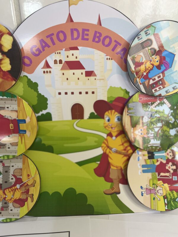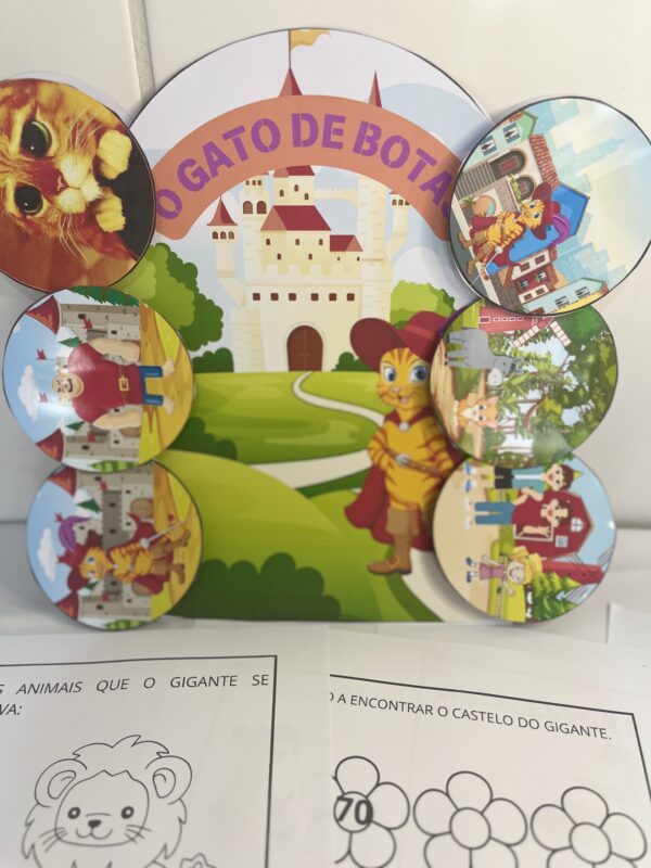 – Gato de Botas: você recebe o arquivo com a luva interativa Gato de Botas, atividades com caça-palavras e para o aprendizado numérico. Atividade de Arte: pinte e dê vida ao Gato de Botas e seus acessórios mágicos.