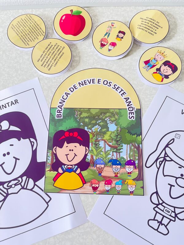 – Branca de Neve: você recebe o arquivo com a luva interativa da Branca de Neve e ilustrações dos personagens da Branca de Neve e os 7 anões para colorir.