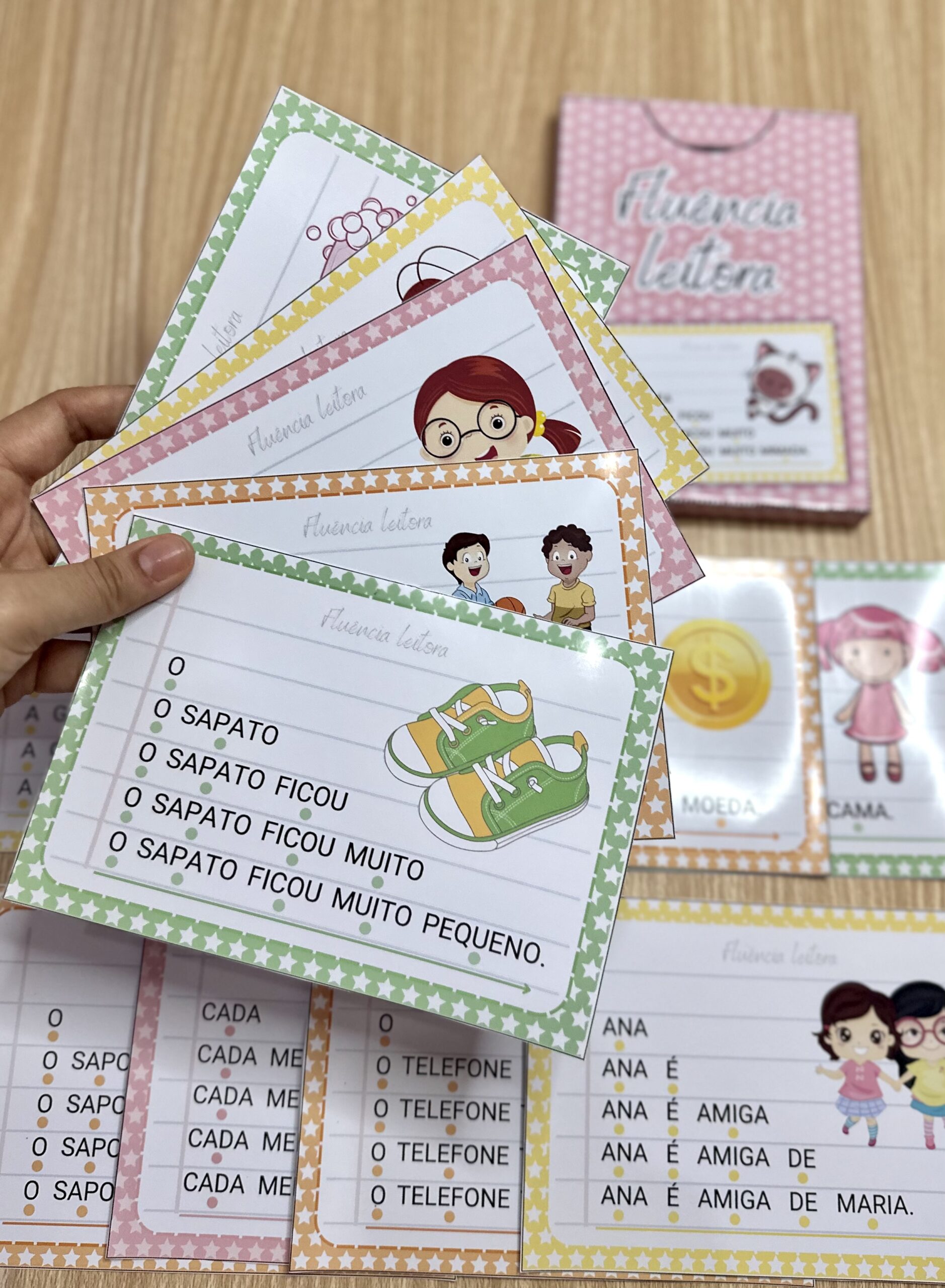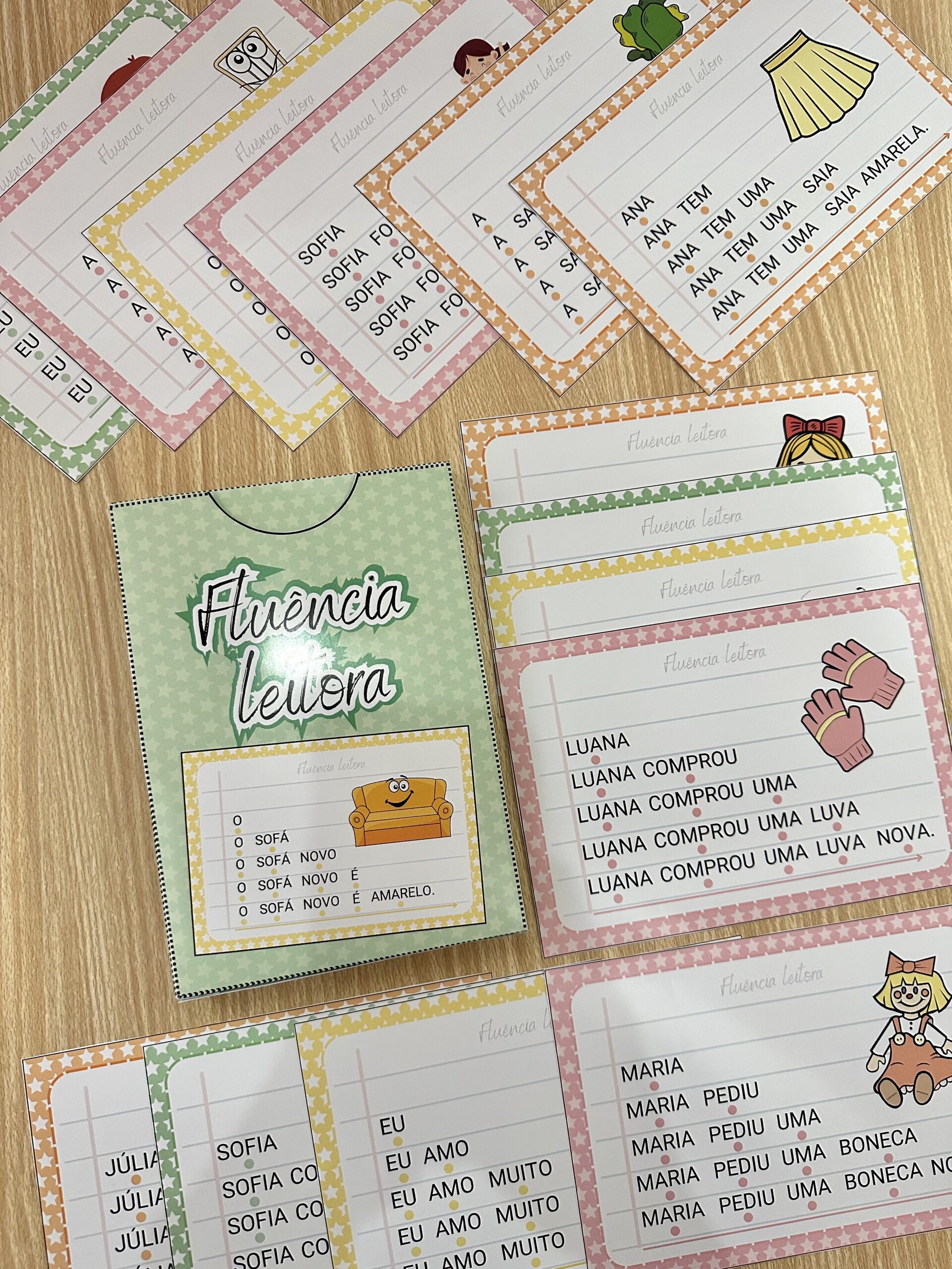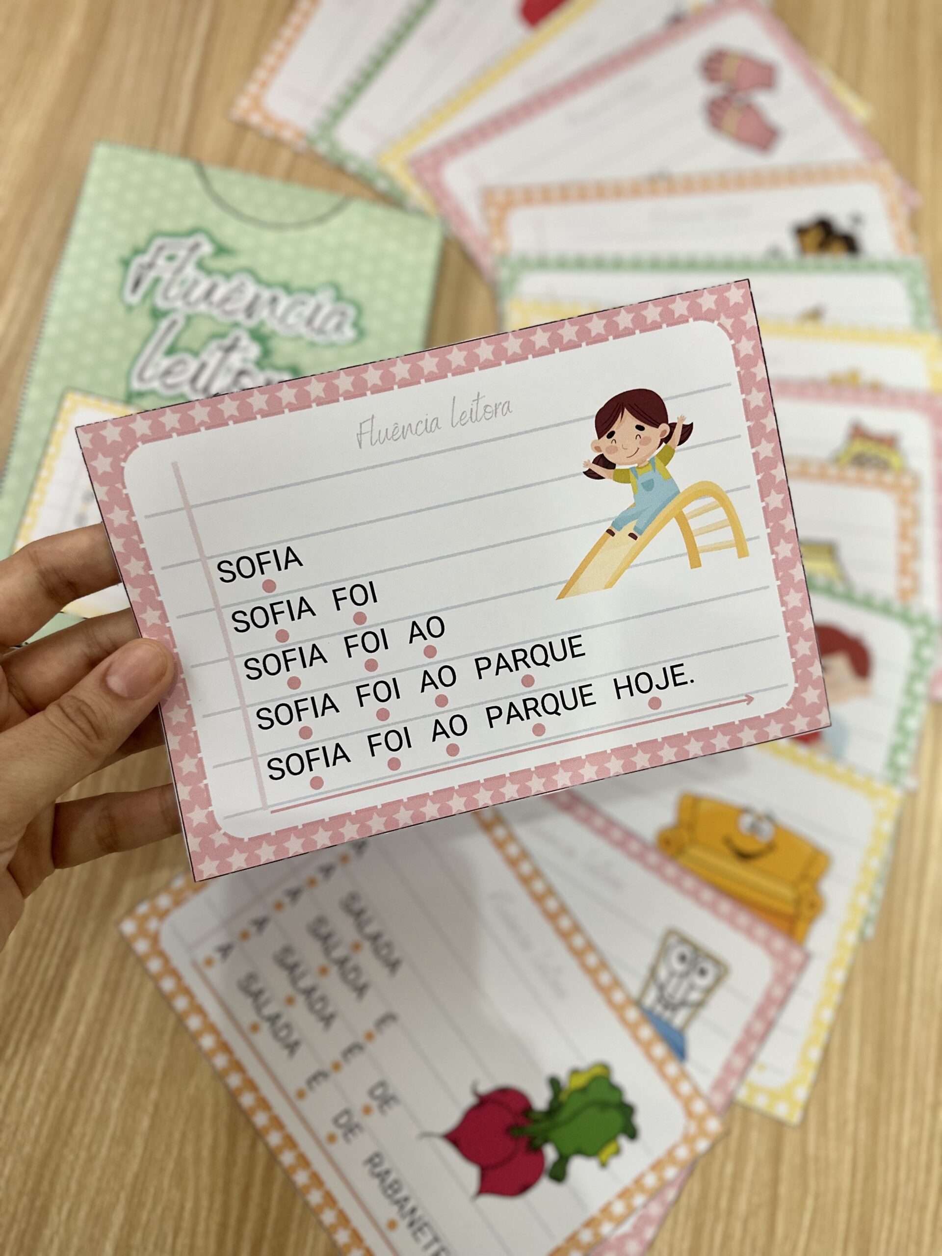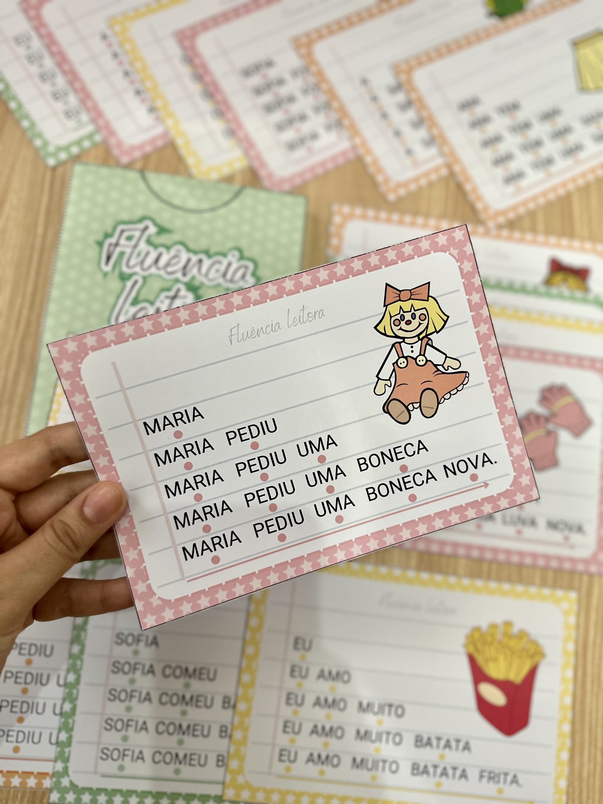 Fluência Leitora: inclui 14 fichas de leitura com palavras simples, para desenvolver a fluência leitora em crianças em fase de alfabetização. Esse método desenvolve a capacidade de ler um texto com agilidade, precisão e com expressão adequada, através do aumento gradativo das palavras a serem lidas em uma frase, o que faz com que a criança consiga ler de forma autônoma e segura.