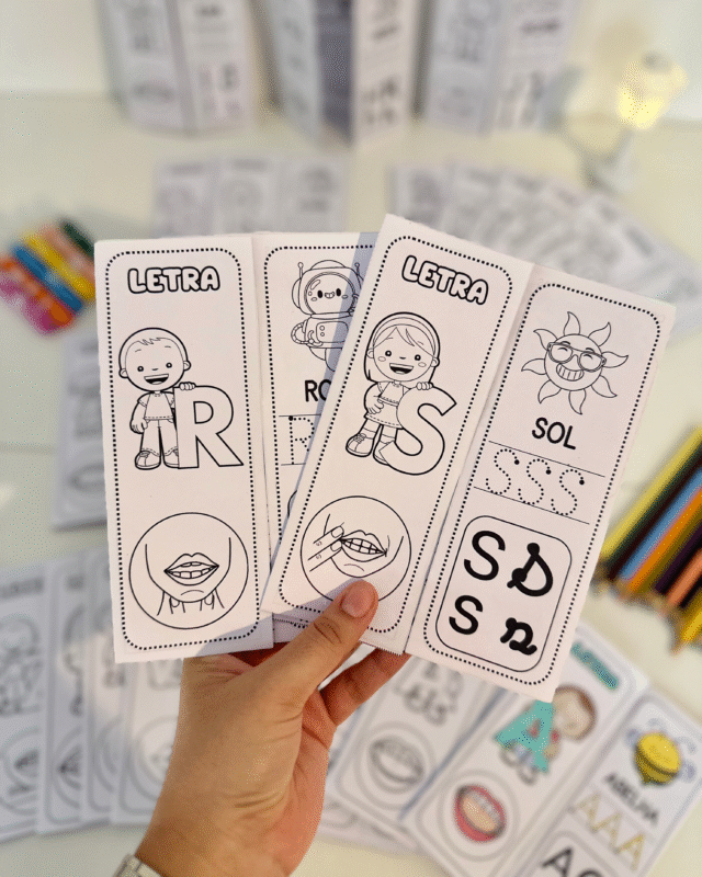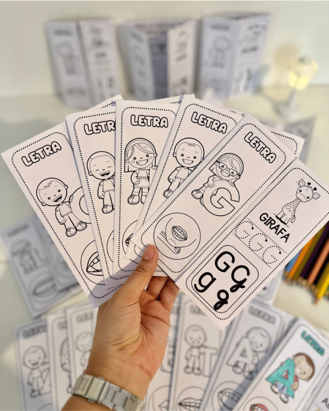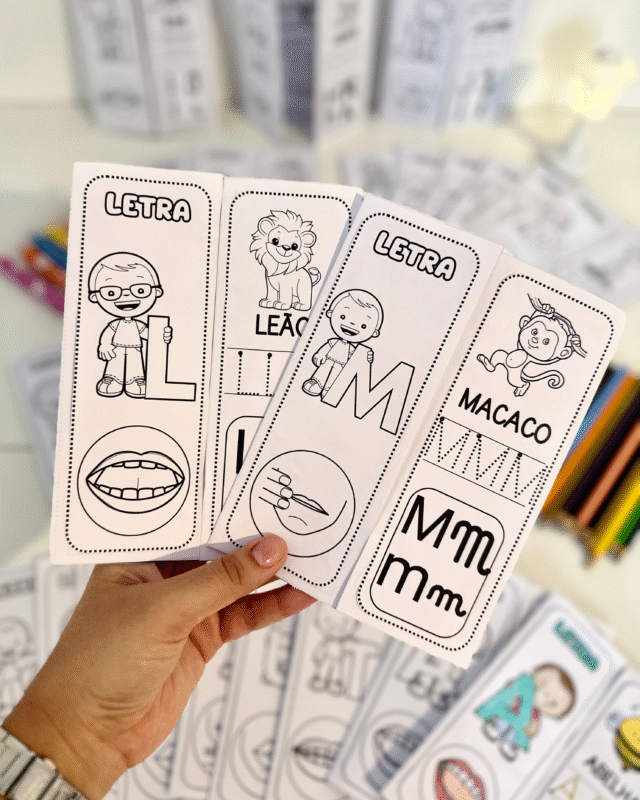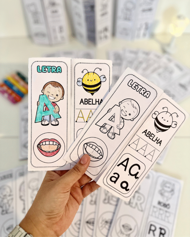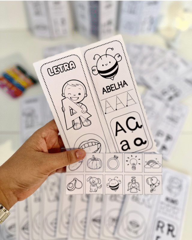 Cada letra do alfabeto conta com um livrinho individual, desenvolvido para estimular o aprendizado ativo da criança, unindo leitura, escrita, coordenação motora e consciência sonora.