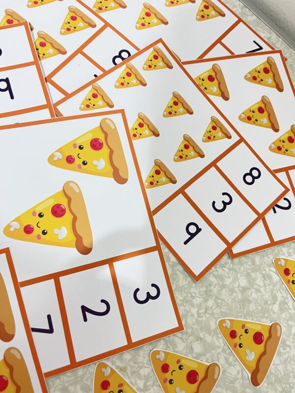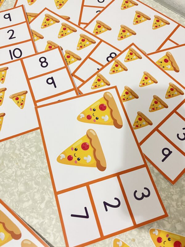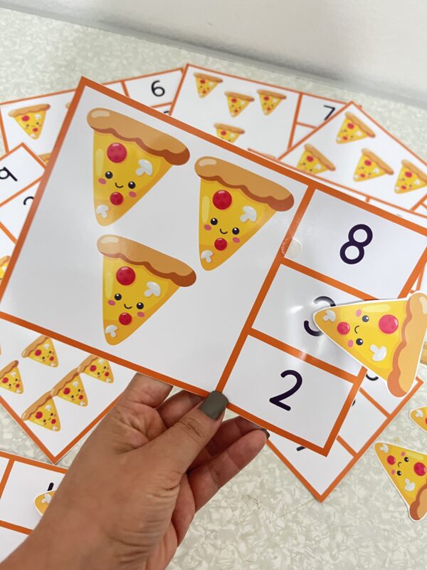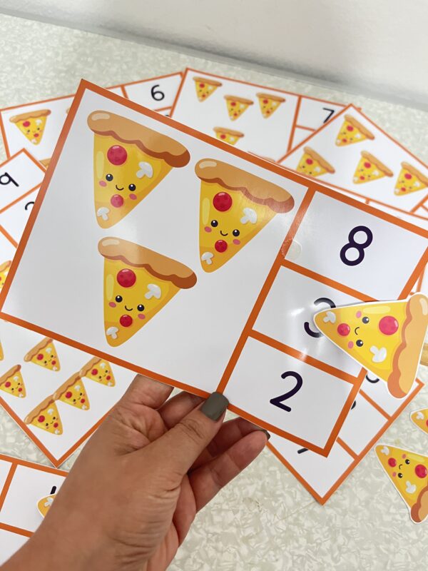 Cada card tem uma quantidade de pedaços de pizza, o aluno deverá contar e marcar o número conforme a quantidade de pedaços.